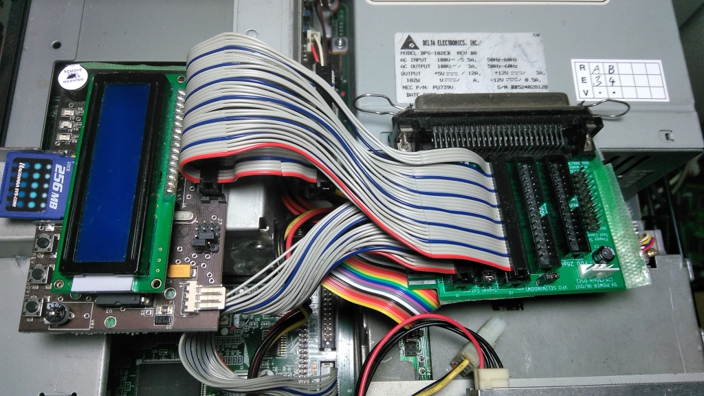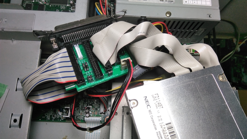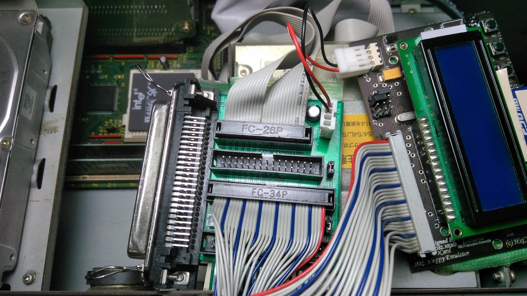 98で使えるように準備を施したフロッピーエミュレータを、通常のフラットケーブル(34ピン)で接続した例
